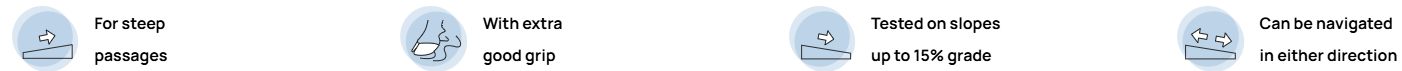 MONTA is specially designed for steep walkways. Beside helping to support the hoof, the V-shaped rib profile also promotes the drainage of liquids. Further, the square imprinting between the ribs boosts grip. In practice, the mat has proven its effectiveness on slopes up to 15% grade. It can be navigated in either direction. It is ideal for use on stationary, concrete loading ramps for transporting animals to and from the barn.