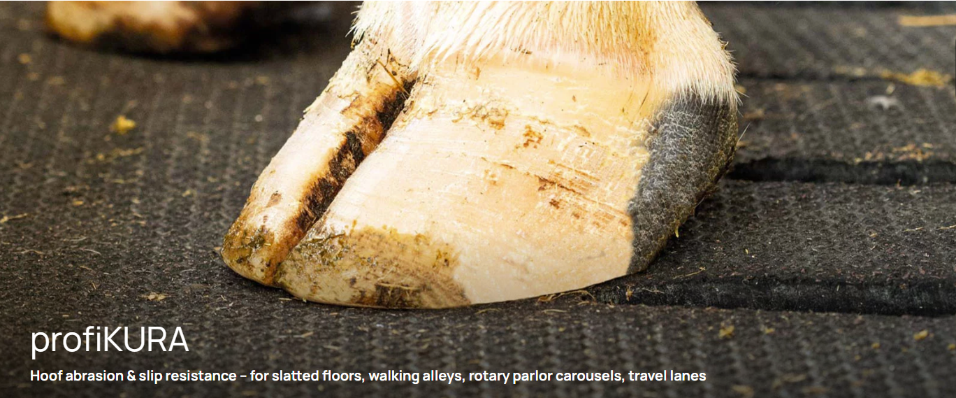 Due to the corundum grit incorporated into the surface, profiKURA offers unique slip resistance. Moreover, the abrasive helps to ensure natural hoof abrasion: The soft-abrasive surface preserves a high heel and a well-defined load-bearing wall edge. Even on heavily drying walking alleys – on which smear layers often form – profiKURA demonstrates excellent slip resistance. Despite this fact, the surface does not have deep profiling, making it very hygienic and easy to clean.